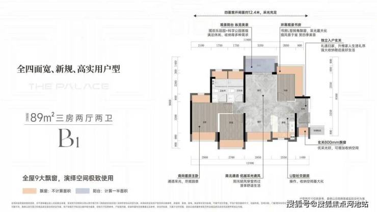 亮点1:客厅270度采光设计,客厅更是采用了当下最流行的设计风格「无主厅化」,而且客厅的凸窗进深达到了80CM。