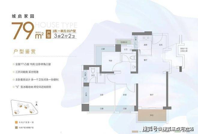 79㎡的3房2厅2卫,设计的是经典竖厅格局,客厅3.3米开间,LDKB一体化,S墙设计预留冰箱卡槽位,动静分区,三开间朝南,3个卧室分别做到了主卧12.1㎡/次卧7.36㎡/次卧6.67㎡(包含墙体飘窗),主卧+1个次卧270°飘窗设计,U型厨房,公卫三段式分离,得房率约88%(包含赠送),东南或西南朝向。