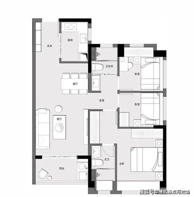 户型方正通透,全南向布局;客餐厅一体化;卧室全飘窗,雅致通透;贴心工卫设计、干湿分离。