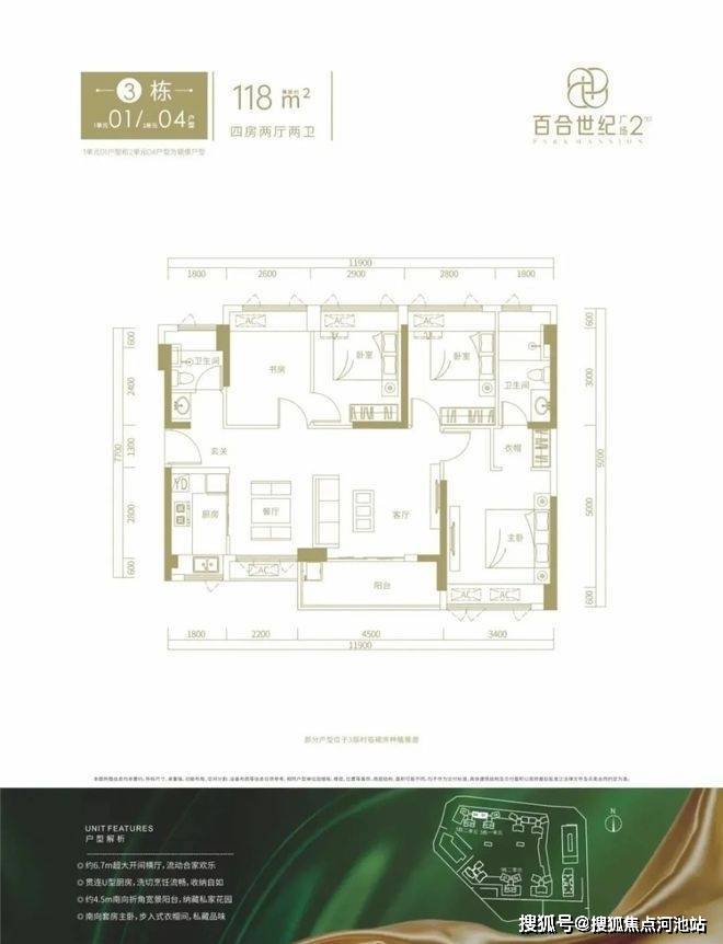 118㎡的4房2厅2卫,3栋1单元01/3栋2单元04户型,设计的是横厅南北通透格局,进门入户玄关,客餐厅6.7米开间,LDKB一体化设计,四开间朝南,得房率约76%(不含赠送),阳台主朝正南向。套内面积89.68㎡+赠送15.06㎡=实得104.74㎡,加上赠送得房率约88.76%。