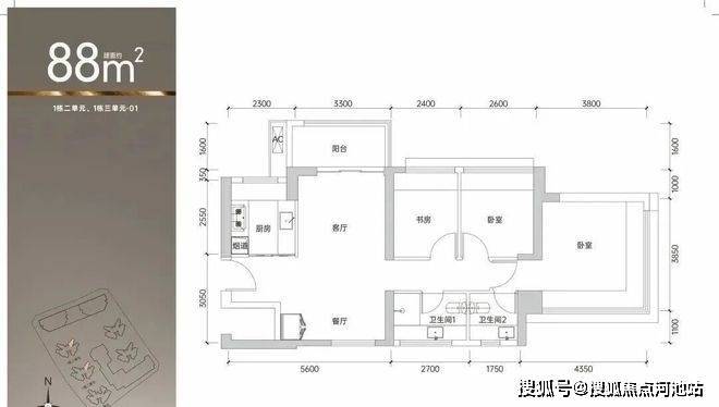 01户型:88平(南北通透)单价39900-40800,总价351-359万。