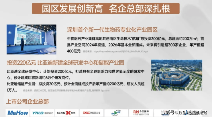 片区园区发展迅猛,深圳首个新一代生物药专业化产业园区,生物药创新发展先导区总投资300亿元,总建面约200万㎡;首批产业空间2024年投运,2026年基本全部建成。未来将引进超300家企业,年产值超400亿元;