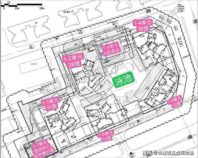 共规划建设7栋楼体,其中5栋为28-38层的高层住宅,共504户,均采用2梯4户或3梯4户的设计,另有1栋6层商业和1栋21层的办公产品,此外,小区内设有泳池配套。