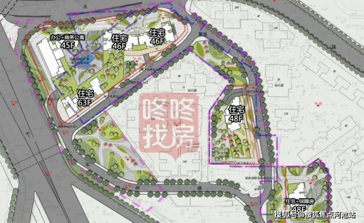根据规划,项目分两个地块开发,用地面积2.8万㎡,计容总建面达12.8万㎡。其中,住宅88900㎡(含保障性住房8300㎡),商业26750㎡,商务公寓11100㎡,公共配套设施1750㎡,地下商业面积750㎡。项目由6栋28-47层建筑组成,分别是4栋住宅、1栋写字楼和1栋保障房,最高的建筑高度达168米。项目将打造成集住宅、公寓、商业服务、文化娱乐为一体的小型综合体。