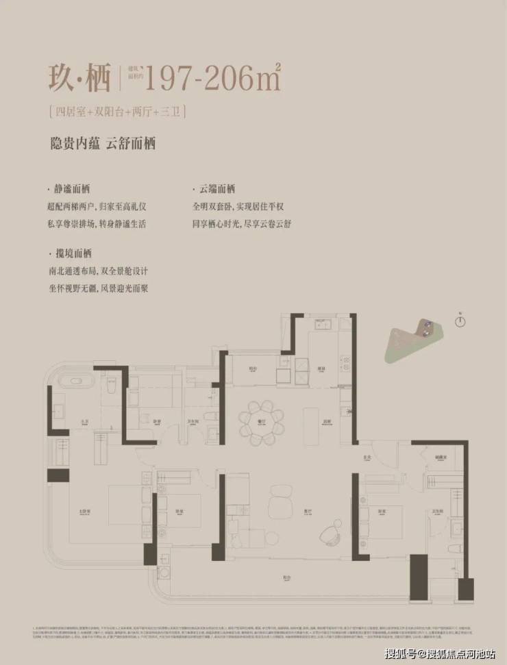 197-206m²的4房2厅3卫2阳台,竖厅格局,客厅6.1米开间,LDKB大方厅设计,2梯2户,尊享专梯专户,私享入户公区,进门配置储物间,五开间朝南,主卧270°无柱转角飘窗,双套房设计,中西双厨房,主卫配置浴缸,得房率约94.6%(包含赠送),不含电梯入户,南北双阳台,小阳台看大运公园山景,客厅连接2个次卧出超大观景大阳台,东南朝向,俯瞰整个大运中心。