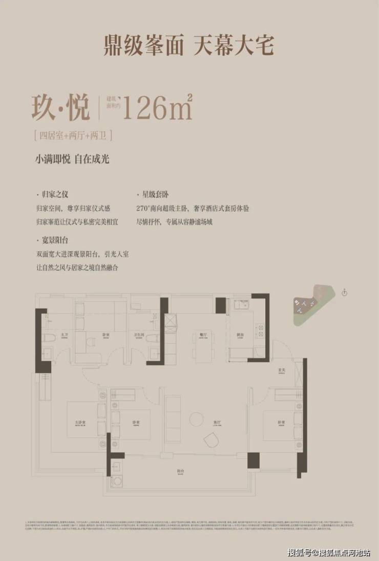 126m²的4房2厅2卫,竖厅南北通透格局,客厅4.3米开间,餐客厅分离设计,四开间朝南,全屋八面飘窗,主卧做到了270度转角无柱飘窗,U型厨房,卫生间干湿分离,得房率约95.2%(包含赠送),客厅连接次卧出7.1米长的观景大阳台,全部主朝西南向,看大运公园景观。