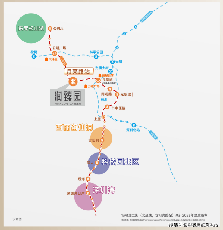 交通配套:润宏城家门口是主干道松白路,自驾半小时可达南山,周边还有南光高速、龙大高速、深圳外环高速等交通要道,13号地铁线”月亮路站“距离约300米,目前还在建设当中,预计在2025年底-2026年初开通运营,1站直达凤凰城换乘6号线,3站至光明城高铁站,未来通过13号线可快速连接南山科技园、后海总部等核心区域,未来该线路将延伸至东莞松山湖,并接驳29号线(规划中),形成大湾区黄金轴线。