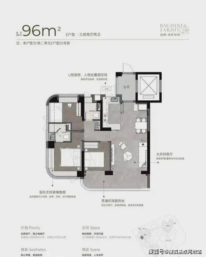 96m²三房两厅两卫的E户型:从空间布局来看,U 型厨房的设计极为人性化,大开间客厅与宽阳台是整个户型的最大亮点,西南向视野使得整个户型采光充足,贯通式阔景阳台与客厅、卧室双通,极大地拓展了生活空间的宽度。主卧的飘窗台也是一大亮点,弧形无柱转角飘窗不仅提供了广阔的视野,还增加了室内的采光。