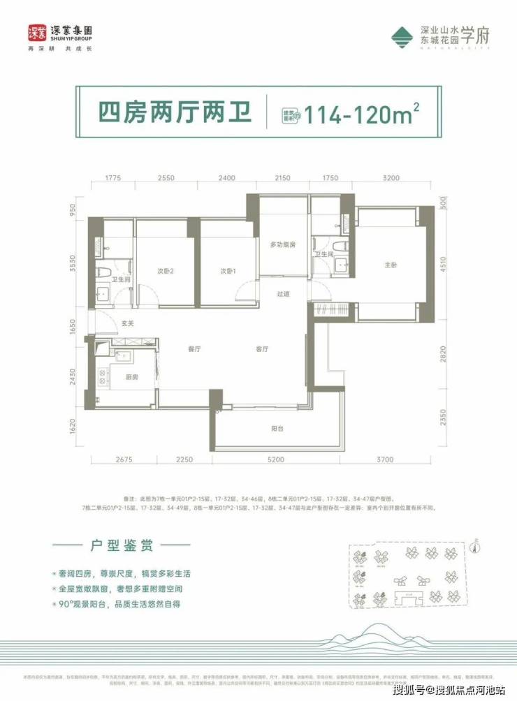 114-120㎡的4房2厅2卫,设计的是横厅南北通透格局,客餐厅一体化,4个卧室分别做到了3.2米/2.55米/2.4米/2.15米的宽度,主卧南北通透,5.2米长的L型大阳台,U型厨房,卫生间干湿分离,得房率:75%(不含赠送),阳台主朝东南向。