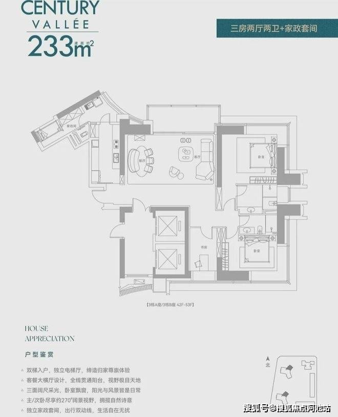 2、8 梯 3 户 、双梯私家入户, 打造 3.5 米层高,高阔的居住体验,深圳住宅天花板,金钥匙服务管家体系标准