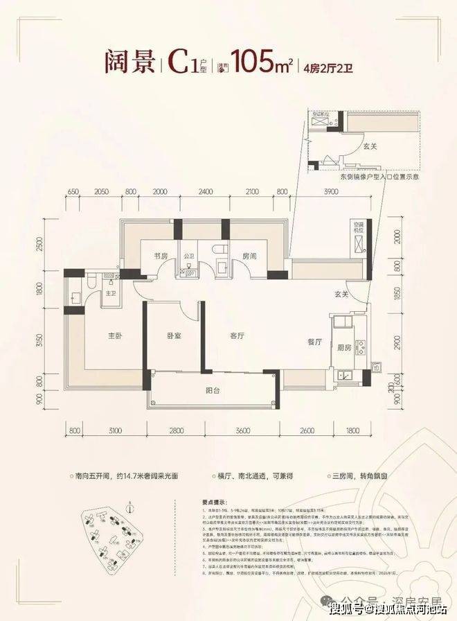 105㎡的4房2厅2卫,设计的是横厅南北通透格局,客餐厅6.2米开间,五开间朝南,约14.7米奢阔采光面,分别做到了主卧16.9㎡/次卧8.96㎡/次卧8.12㎡/次卧7㎡(包含墙体飘窗),U型厨房,卫生间干湿分离,得房率约100%(包含赠送),客厅连接次卧出10.88㎡的大阳台,首推的1/2栋主朝西南向。赠送面积约25.72㎡。