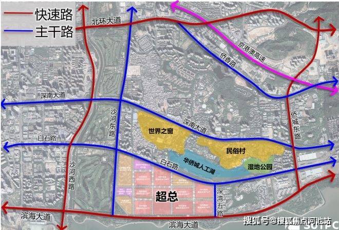 南瞰深圳湾全海景,北观华侨城国家湿地公园,世界之窗,锦绣中华、民族文化村,东面为华侨城蓝楹湾别墅群、125万平欢乐海岸、红树林公园,西北有靠,东南无挡。