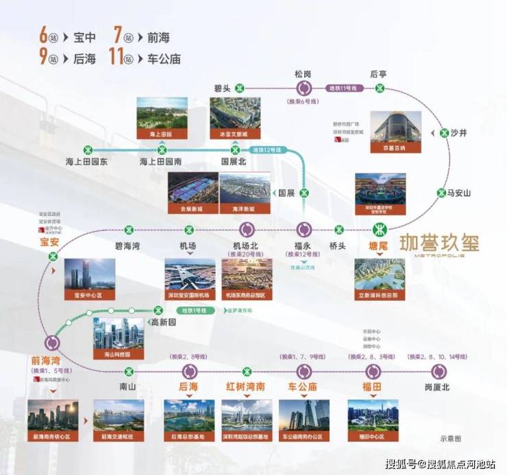 地铁配套:项目紧邻11号线塘尾站,距离约300米,堪称"下楼即达地铁"。乘坐11号线,4站可直达宝安机场,6站到宝中,7站到前海湾,9站到后海、11站到车公庙,工作日高峰时段班次间隔4分钟,末班车至00:16,通勤效率高。从塘尾站到福田站约需45分钟,高峰期班次密集,适合在南山、福田工作的上班族。