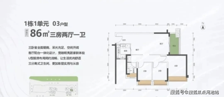 86㎡的3房2厅1卫,1栋1单元03户型,设计的是竖厅格局,客厅3.5米开间,LDKB一体化设计,进深10.05米,主卧全朝南,动静分区,3个卧室分别做到了主卧11.67㎡/次卧8.64㎡/次卧8.46㎡(包含飘窗),U型厨房,卫生间三段式分离,得房率约:80%(不含赠送),阳台5.5㎡东南朝向。套内面积68.8㎡+赠送面积8.5㎡=实用面积77.3㎡,加上赠送后得房率约89.88%。