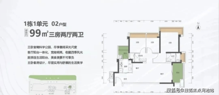 99㎡的3房2厅2卫,1栋1单元02户型,设计的是竖厅格局,客厅3.5米开间,LDKB一体化设计,进深11.7米,动静分区,三卧室朝东北向看科学公园,3个卧室分别做到了主卧18.06㎡/次卧9.57㎡/次卧7.59㎡(包含飘窗),二字型厨房还带1个生活阳台,公卫三段式分离,得房率约:80%(不含赠送),阳台6.55㎡东南朝向。套内面积79.2㎡+赠送面积12.58㎡=实用面积91.78㎡,加上赠送后得房率约92.7%。
