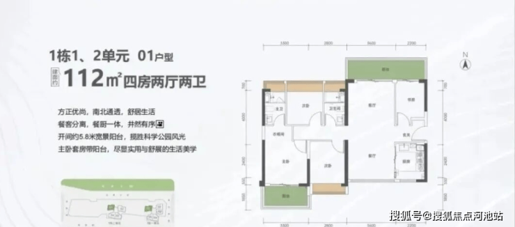 112㎡的4房2厅2卫,1栋1/2单元01户型,设计的是竖厅南北通透格局,进门入户玄关,客厅3.6米开间,餐客分离,餐厨一体设计,四开间朝南,主卧套房带阳台,4个卧室分别做到了主卧18.43㎡/次卧10.5㎡/次卧9.12㎡/次卧7.26㎡(包含墙体飘窗),客厅连接次卧出9.28㎡的巨幕大阳台,U型厨房,卫生间干湿分离,得房率约:80%(不含赠送),阳台主朝东北向看科学公园。套内面积89.6㎡+赠送面积16.1㎡=实用面积105.7㎡,加上赠送后得房率约94.37%。