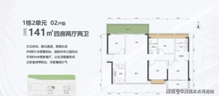 141㎡的4房2厅2卫,1栋2单元02户型,设计的是竖厅南北通透格局,进门入户玄关,客厅4米开间,餐客分离,餐厨一体设计,四开间朝南,主卧套房带阳台,4个卧室分别做到了主卧21.96㎡/次卧13.2㎡/次卧10.2㎡/次卧9.86㎡(包含墙体飘窗),客厅连接次卧出11.55㎡的巨幕大阳台,U型厨房,卫生间干湿分离,得房率约:80%(不含赠送),阳台主朝东北向看科学公园。套内面积112.8㎡+赠送面积18.5㎡=实用面积131.3㎡,加上赠送后得房率约93.12%。