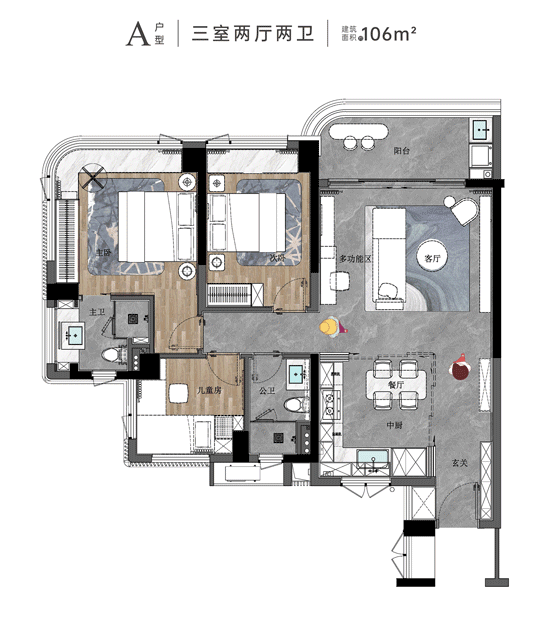 ◉LDKB客餐厅大横厅设计,客餐厨一体净开间达近8.3米,客餐厅近6米宽,相当于市场上豪宅开间尺度;厨房配备中西厨,在同面积户型非常难得。
