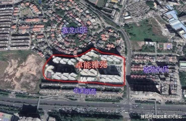 卓能雅苑由7栋较高18层的住宅和一栋两层的幼儿园组成;北边的嘉龙山庄和荔苑山庄是别墅区;华美丽苑是一个较高6层的多层住宅小区。