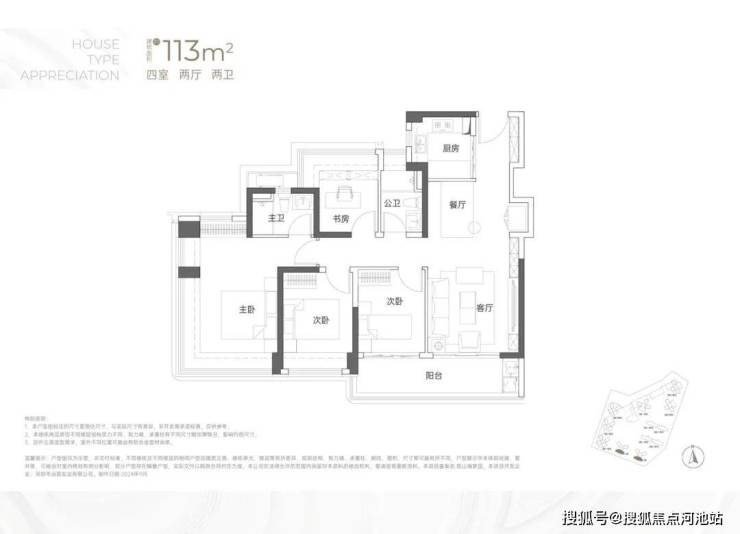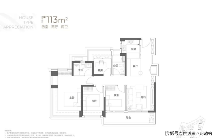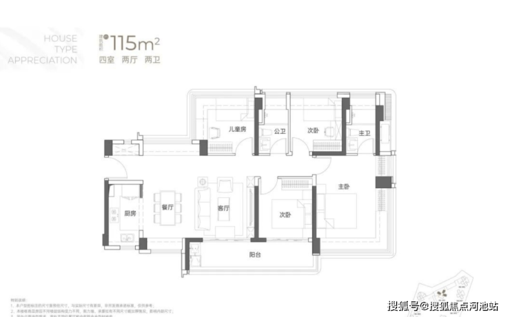 115㎡4房2卫,均为横厅设计且阳台宽敞,有东南、西南、西北三种朝向,户型格局差异小,核心区别在于阳台设计依朝向和景观调整。