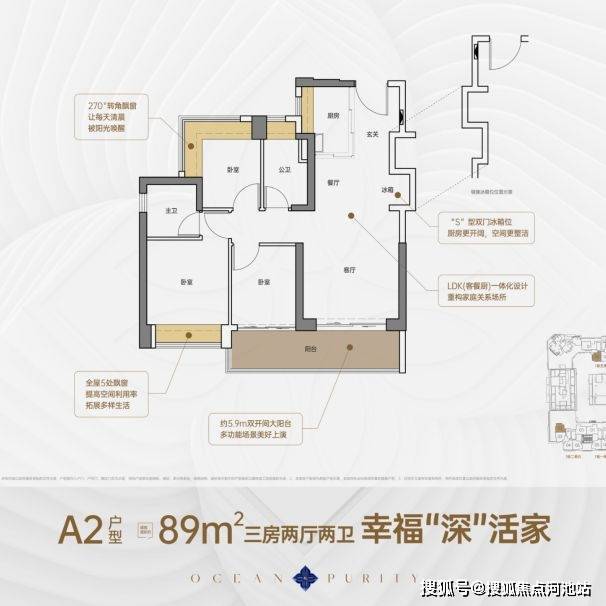 89平3房2厅2卫,竖厅格局,客厅预留冰箱卡槽位,客厅与次卧通阳台,三开间朝南,主卧套房设计展现私密性,次卧270度飘窗,整个户型有 5 个飘和6米大阳台,使用率在 95% 左右。
