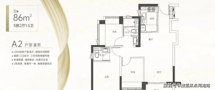 84-86㎡3房2卫:采用竖厅格局,餐客一体,开间3.15m,动静分区合理。S型墙体预留冰箱位,主卧带独立卫生间(1.5卫设计),次卧和公卫干湿分离,空间利用率较高。主卧15㎡,次卧8㎡-10㎡,得房率90%。东南、西南、东北、西北朝向!