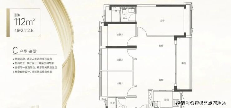 112㎡4房2卫:横厅南北通透设计,餐客厅一体,开间约5.6米,全屋飘窗设计,采光与通风良好。厨房为U型布局,公卫三段式分离,功能分区合理。客厅连接超大阳台5.6m大阳台,增强空间通透感。主卧13-15㎡,次卧8.5㎡-8.6㎡-8.3㎡,得房率可达84%