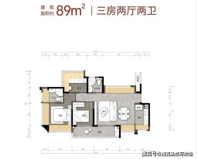 建筑面积约89㎡户型-3房2卫(横厅)