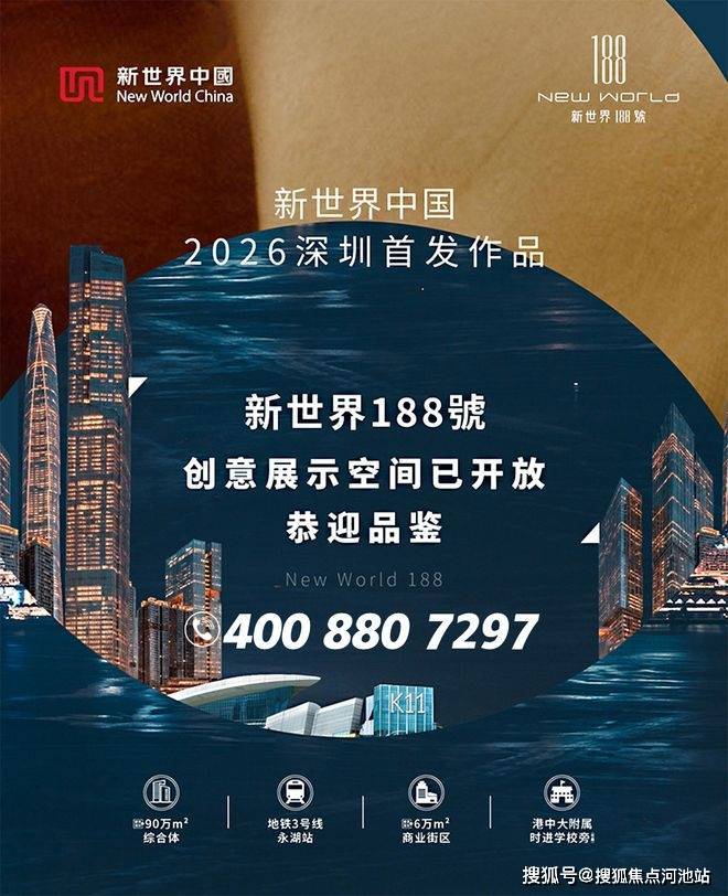 最新消息:深圳龙岗永湖住宅新盘——新世界188号·臻悦(备案名:新璟曜广场),已开放样板房和营销中心,计划2026年5月份取证入市,开盘首推05地块,面积有76㎡的3房1卫,88㎡3房2卫,96-115㎡4房2卫,180㎡5房3卫户型,共1142套房源,全部采用新规户型设计,建面约76三房预计总价245万起,98的四房总价325万起,过来看房提前拨打开发商电话 400 880 7297 进行在线预约的话最终房价还可以更便宜,本次开盘推出的住宅是期房,计划2028年带精装交房!