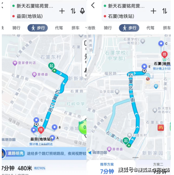 [一] 轨道交通方面,盘博士实测过,距离地铁3号线益田站高德实测步行382米用时5分钟,7号线石厦站步行522米用时7分钟