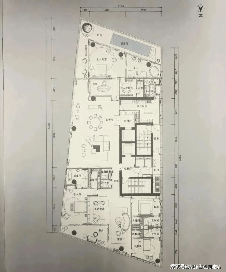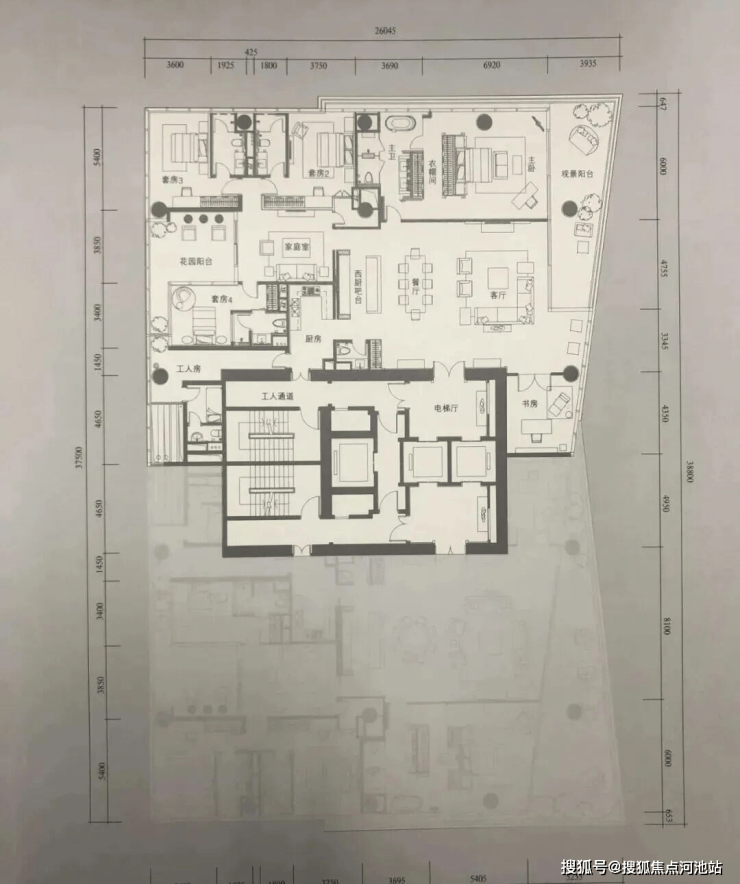 建面约614㎡偶数层户型:4套间+书房+1多功能房+中式厨房,位于北区楼王T4栋,拥有4米层高及360°全景宽约45米的全球最宽公寓观景面。