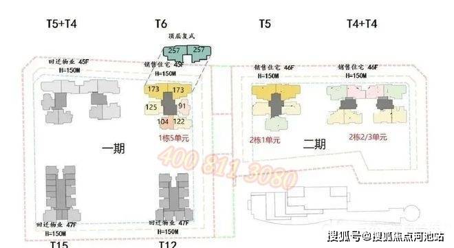 首推一期1栋5单元(45层),91-173㎡3-4房,共232套,以122-175平米4房为主,占比83%,还有两套257平顶复产品。173/257平大户型双电梯独立电梯厅入户,南区91-125平户型3梯4户。