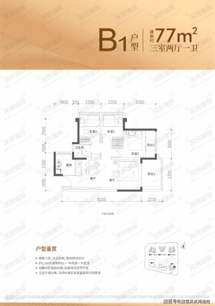 77㎡的3房2厅1卫,设计的是竖厅格局,客厅3.3米开间,进深8.2米,LDKB一体化设计,3个卧室分别做到了主卧11.3㎡/次卧7.28㎡/次卧7.28㎡(包含墙体飘窗),U型厨房,卫生间三段式分离,得房率约88.31%(包含赠送),东南朝向。