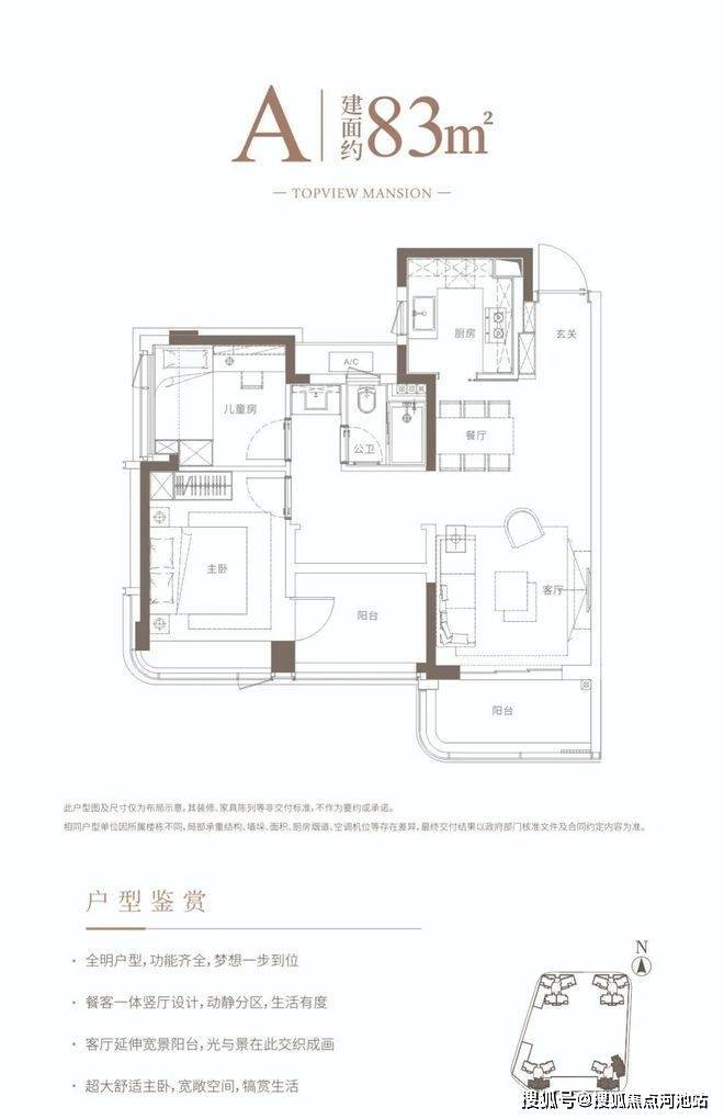 83㎡的3房2厅1卫,设计的是竖厅格局,客厅3.4米开间,客餐厅一体化,三开间朝阳,3个卧室分别是3米/2.9米/2.6米的宽度,U型厨房,卫生间三段式分离设计,得房率:75.64%(不含赠送),有朝南向或东北向。