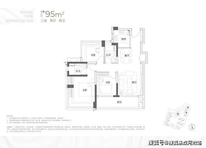 95㎡的3房2厅2卫:户型分布于2栋1-3单元,南向、东北朝向,竖厅格局带6.3米宽大阳台。