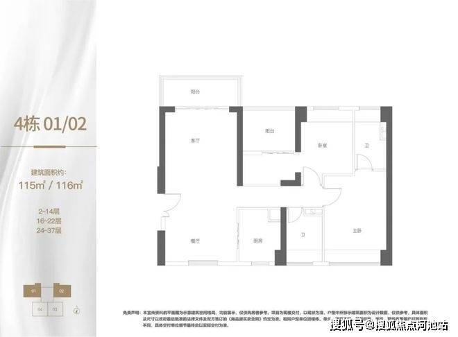 4栋大部分为116平3房,3梯4户,2户朝东南看深圳湾海景,2户朝西北看大南山。