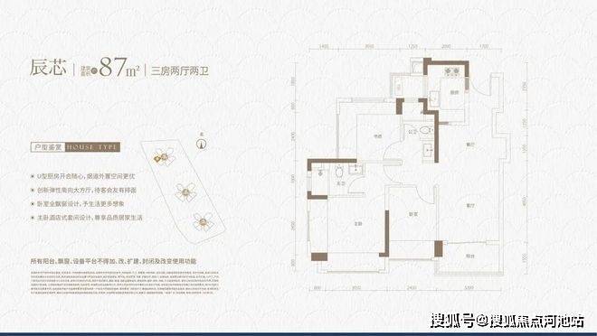 经典竖厅三房二卫户型,87㎡户型的放大版。