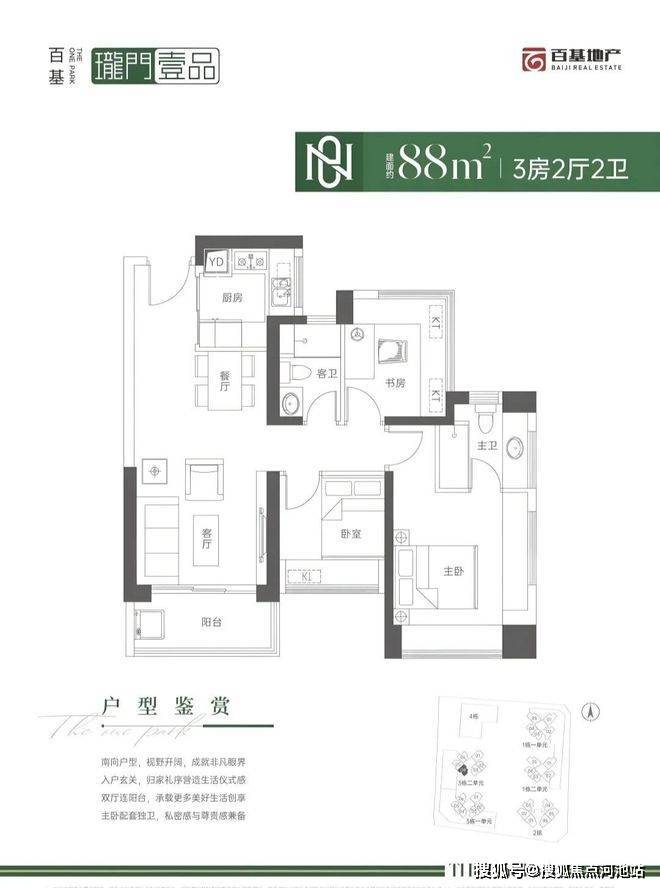 99㎡的3房2厅2卫,设计的是经典竖厅格局,进门入户玄关,客厅3.9米开间,LDKB一体化设计,动静分区,四开间朝南,主卧三面飘窗,U型厨房,卫生间干湿分离,得房率:71.29%(不含赠送),东南朝向。