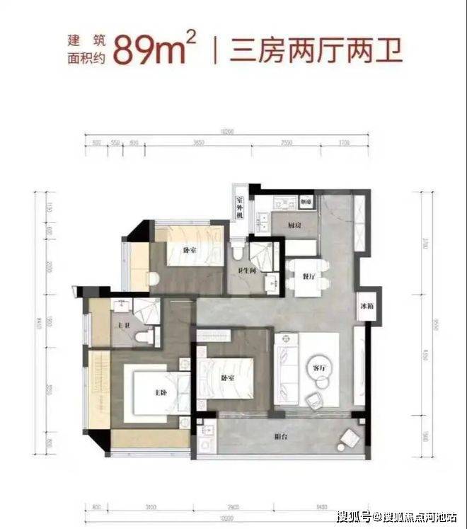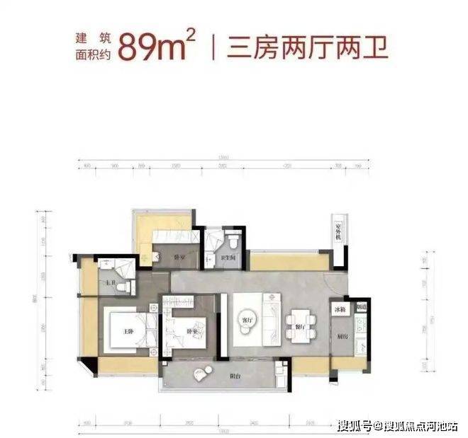 89㎡的3房2厅2卫,设计的是竖厅格局,客厅3.4米开间,LDKB一体化,S墙设计预留冰箱卡槽位,3个卧室分别做到了3.9米/2.9米/2.6米的宽度,客厅连接次卧出6.3米长的大阳台,L型厨房,卫生间干湿分离,有西北、西南或东南朝向。
