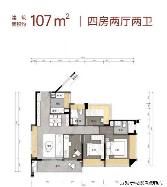 107m²的4房2厅2卫,折后总价429-465万/套,单价4.05-4.38万/m²。