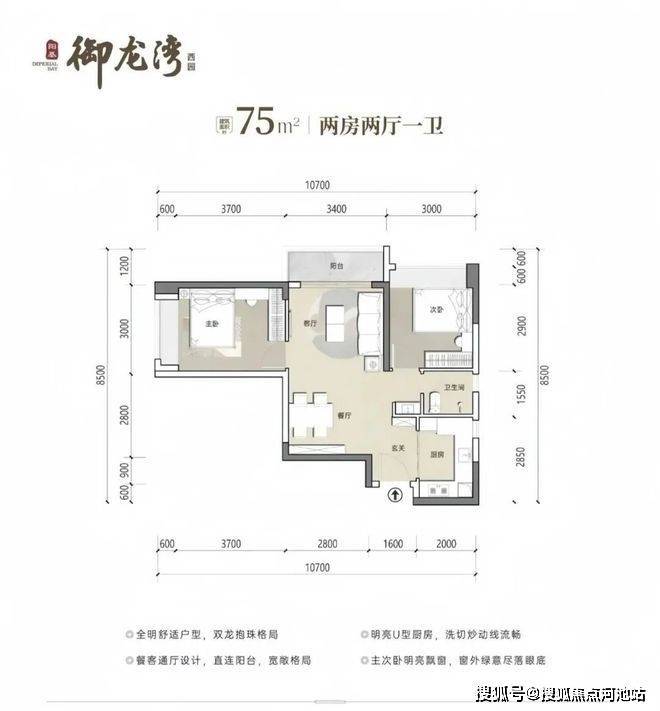 75㎡2房1卫,分布在1栋3/4单元03/06户型,设计的是竖厅稀缺的双龙抱珠格局,客厅开间3.4米,U型厨房,卫生间三段式分离设计,得房率约73.26%(不含赠送),东南或西北朝向,加上赠送得房率约80%