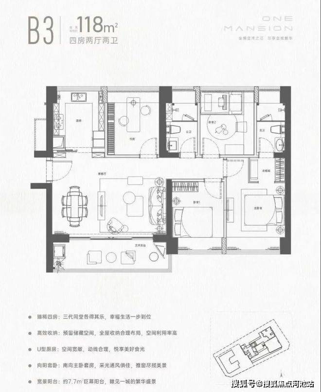 建面约118㎡的4房2厅2卫,拥有独立门户,是项目的“楼王”产品。四居室可以容纳三代同堂,各得其乐。南向大主卧套房,采光通风俱佳,推窗尽览美景;大宽景阳台足足约7.7m²,完全就是一个“多功能区”的配置,想要阳光房、玩具屋,还是茶室?都可以随心实现呦。