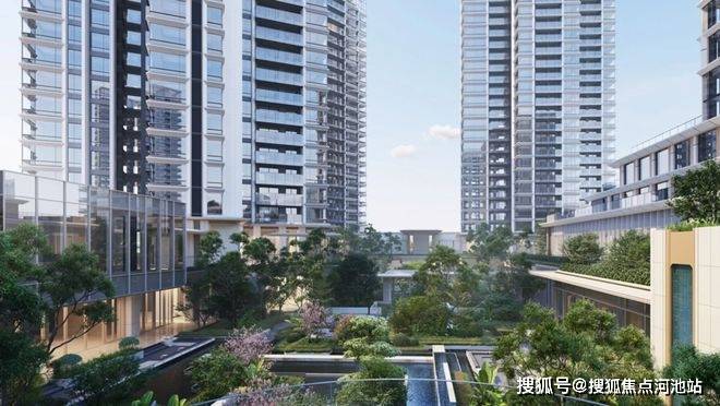 项目整体绿化率约40%,还打造了近9000㎡下沉式庭院,配置了多功能水院会所、室内景观泳池、全龄儿童生活场、林下休憩空间等。