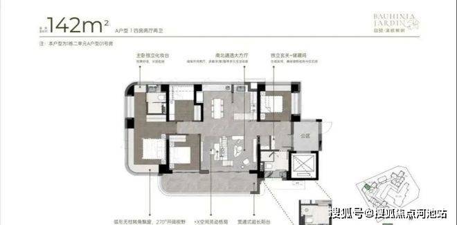 142m²四房两厅两卫的A户型:双龙抱珠户型,得房率约92-100%(含赠送),朝向为西南或东南。