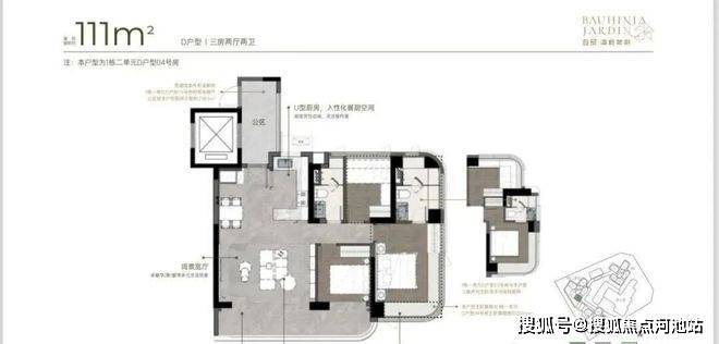 111m²三房两厅两卫的D户型:竖厅格局,得房率约92-100%(含赠送),朝向为西南或东南。