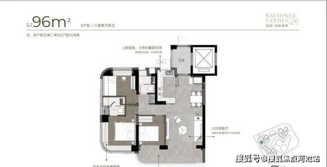 96m²三房两厅两卫的E户型:竖厅格局,拥有超宽客厅,LDKB一体化设计,动静分区。三开间朝南,得房率高达92-100%(含赠送部分)