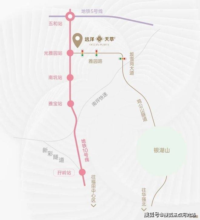 远洋天萃家门口就是“福田专线”——10号地铁线“光雅园站”B出口,1站到五和枢纽站,可换乘5号地铁线/深大城际,3站可到龙华深圳北站,3站到福田、4站到南山。