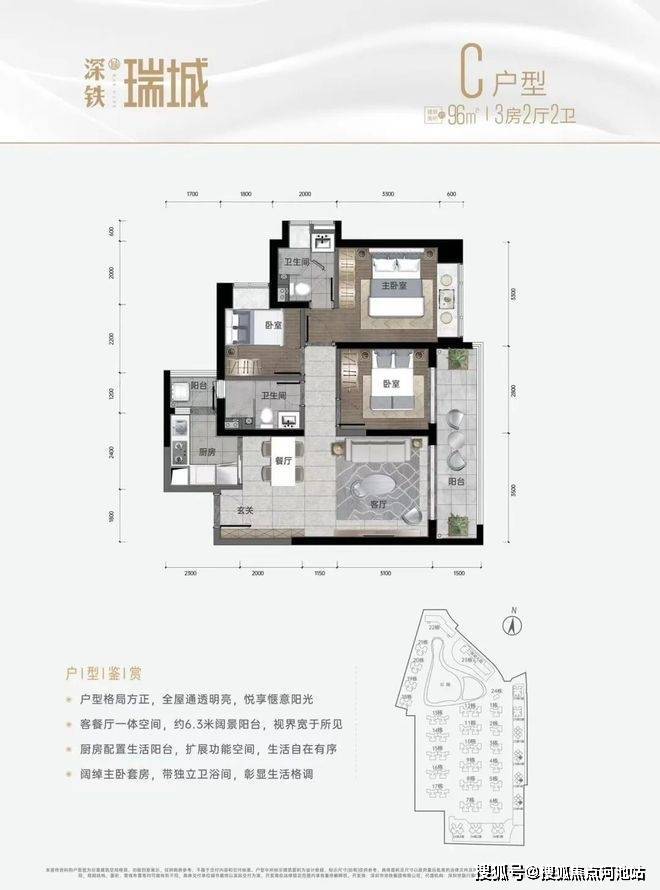深铁瑞城在售户型以建面约96-100㎡的三房为主,包含4个户型,全明采光,竖厅南北通透,6.3米观景阳台,主卧套房设计,兼顾舒适性与实用性。