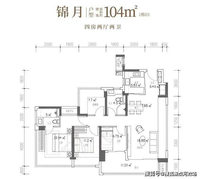 104㎡的4房2厅2卫,设计的是竖厅格局,客厅4.15米开间,LDKB一体化设计,预留冰箱卡槽位,四开间朝南,动静分区,主卧270°无柱转角飘窗还带1个设备平台约1.52平,分别做到了主卧20.34㎡/次卧11.2㎡/次卧7.7㎡/次卧6.75㎡(包含墙体飘窗),U型厨房烟道外置,卫生间干湿分离,得房率约100.71%(包含赠送),客厅连接次卧出大阳台约11.23平,西南朝向。
