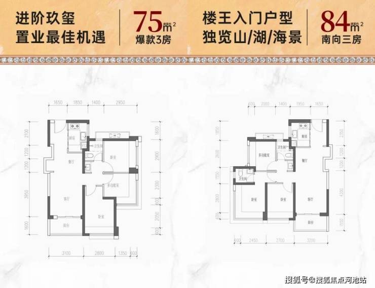 竖厅双龙抱珠格局,客厅3.5米开间,主卧270°转角飘窗,分别做到了主卧15.45㎡/次卧13.57㎡/次卧9.31㎡/次卧6.96m²(含墙体飘窗),U型厨房,房率约74%(不含赠送),加上赠送后得房率约89.34%。